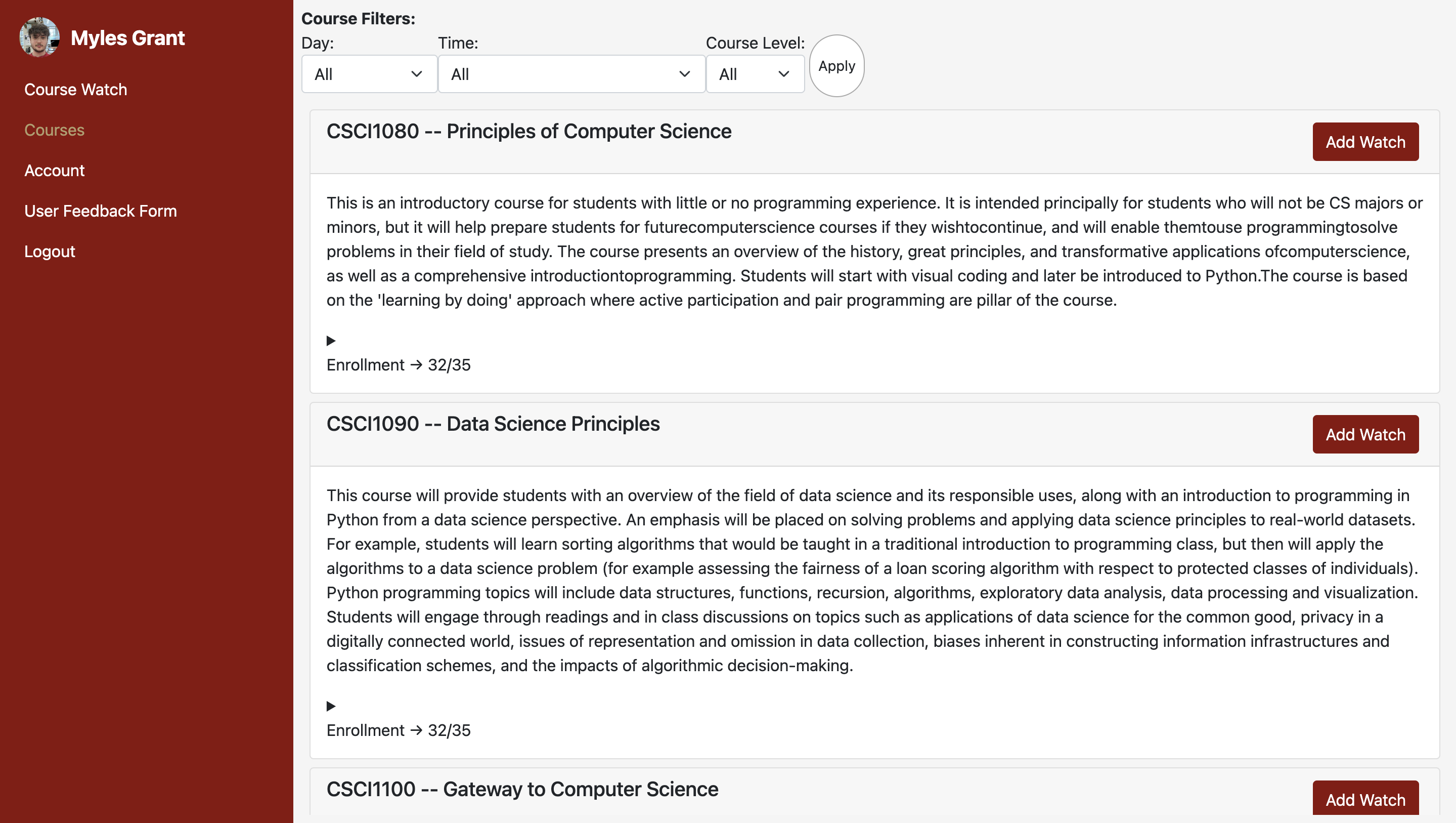Problem: Course reigstration is a nightmare for college students, and knowing when classes have spots open up is a guess-and-check process.