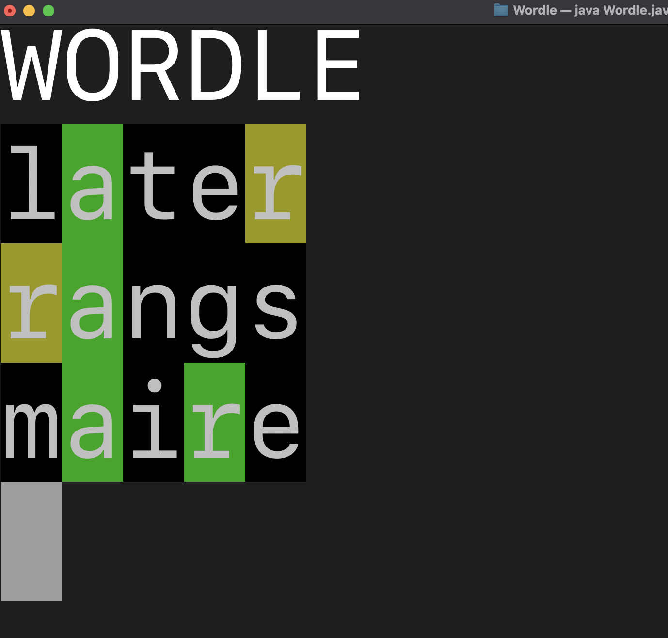 Solution: Using Java, get game information in the form of a csv file and create a version of Wordle that is played (in color) in the terminal.